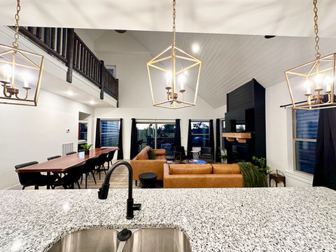 This stylish and cozy modern lodge is perfect for your family lake vacation or group gatherings! Our high vaulted ceilings and open floor plan creates a perfect space for a large group. 2 private covered decks w/ gorgeous views of Table Rock Lake on the upper & beautiful Ozark mountain views and wooded pines on the main level are sure to create a relaxing trip. Our community will offer an outdoor&indoor pool, play area and pickleball! Come roast some marshmallows around our firepit!