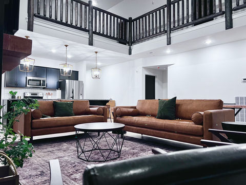 Our Inviting Open Living Room with shiplap fireplace, smart tv and cozy seating for all including 2 Italian leather couches. Vaulted pine ceilings and open railing above make this warm and roomy.